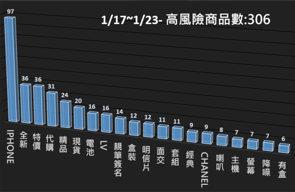 本署電商防詐雷達本週(1/17~1/22)共掃瞄23,016電商平台商品,發現其中306筆為高風險商品,並已提供相關資訊給電商平台進行預防性下架,以降低消費者接觸詐騙商品的風險。