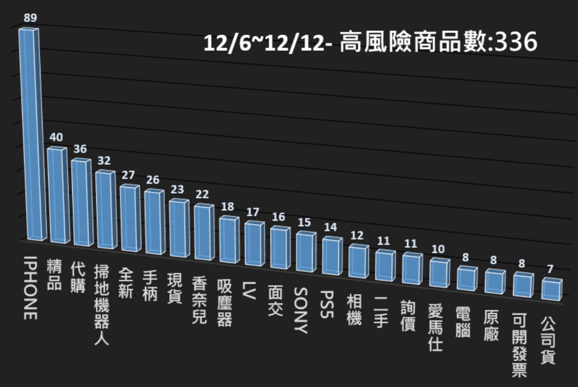 本署電商防詐雷達本週(12/6~12/12)共掃瞄20,879筆電商平台商品,發現其中336筆為高風險商品,並已提供相關資訊給電商平台進行預防性下架,以降低消費者接觸詐騙商品的風險。