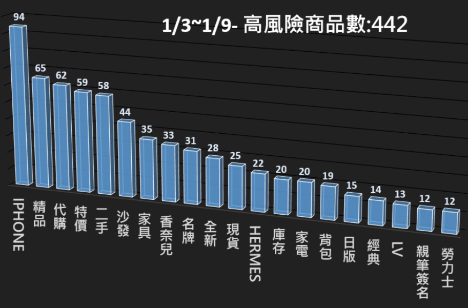 本署電商防詐雷達本週(1/3~1/9)共掃瞄41,848筆電商平台商品,發現其中442筆為高風險商品,並已提供相關資訊給電商平台進行預防性下架,以降低消費者接觸詐騙商品的風險。