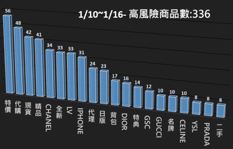 本署電商防詐雷達本週(1/10~1/16)共掃瞄32,255電商平台商品,發現其中336筆為高風險商品,並已提供相關資訊給電商平台進行預防性下架,以降低消費者接觸詐騙商品的風險。