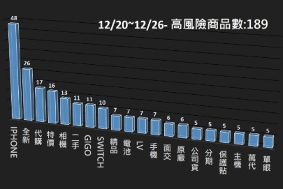 本署電商防詐雷達本週(12/20~12/26)共掃瞄13,917筆電商平台商品,發現其中189筆為高風險商品,並已提供相關資訊給電商平台進行預防性下架,以降低消費者接觸詐騙商品的風險。