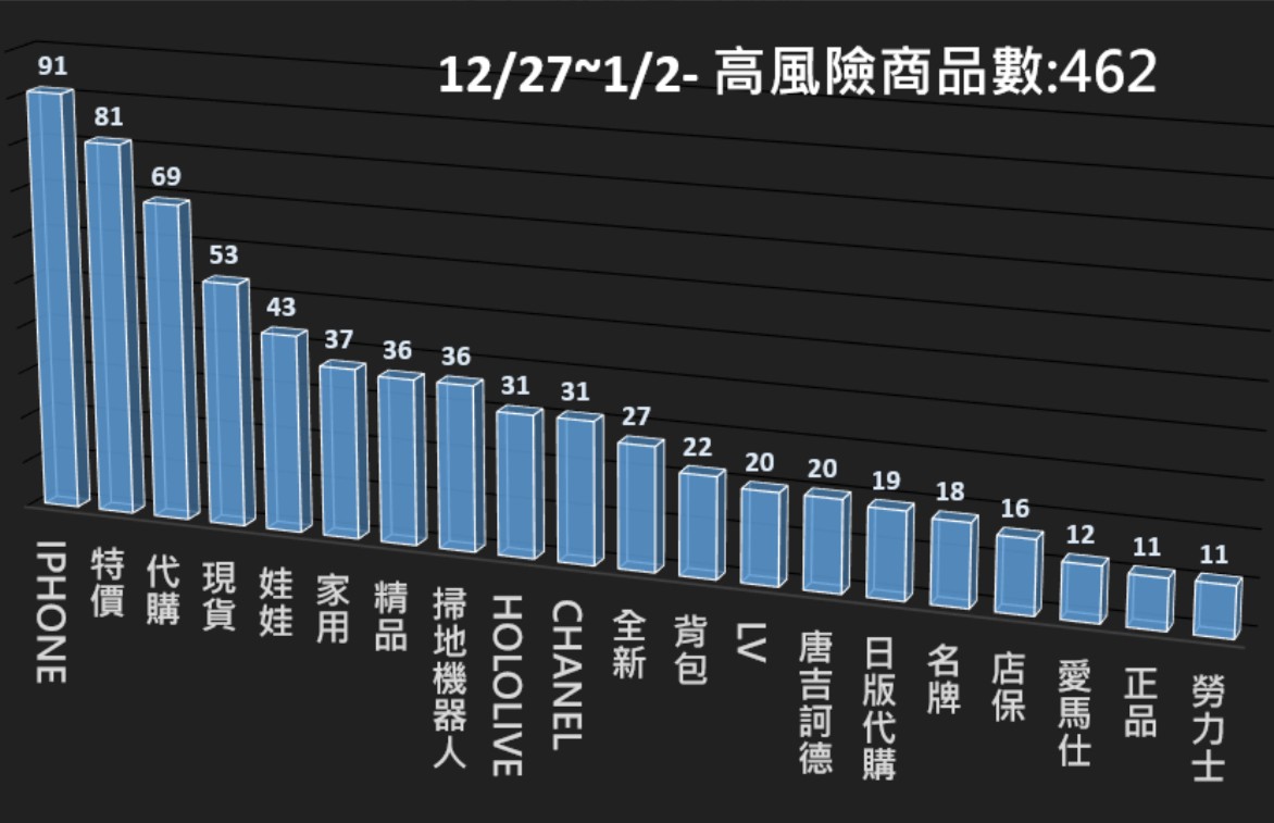 本署電商防詐雷達本週(12/27~1/2)共掃瞄39,977筆電商平台商品,發現其中462筆為高風險商品,並已提供相關資訊給電商平台進行預防性下架,以降低消費者接觸詐騙商品的風險。