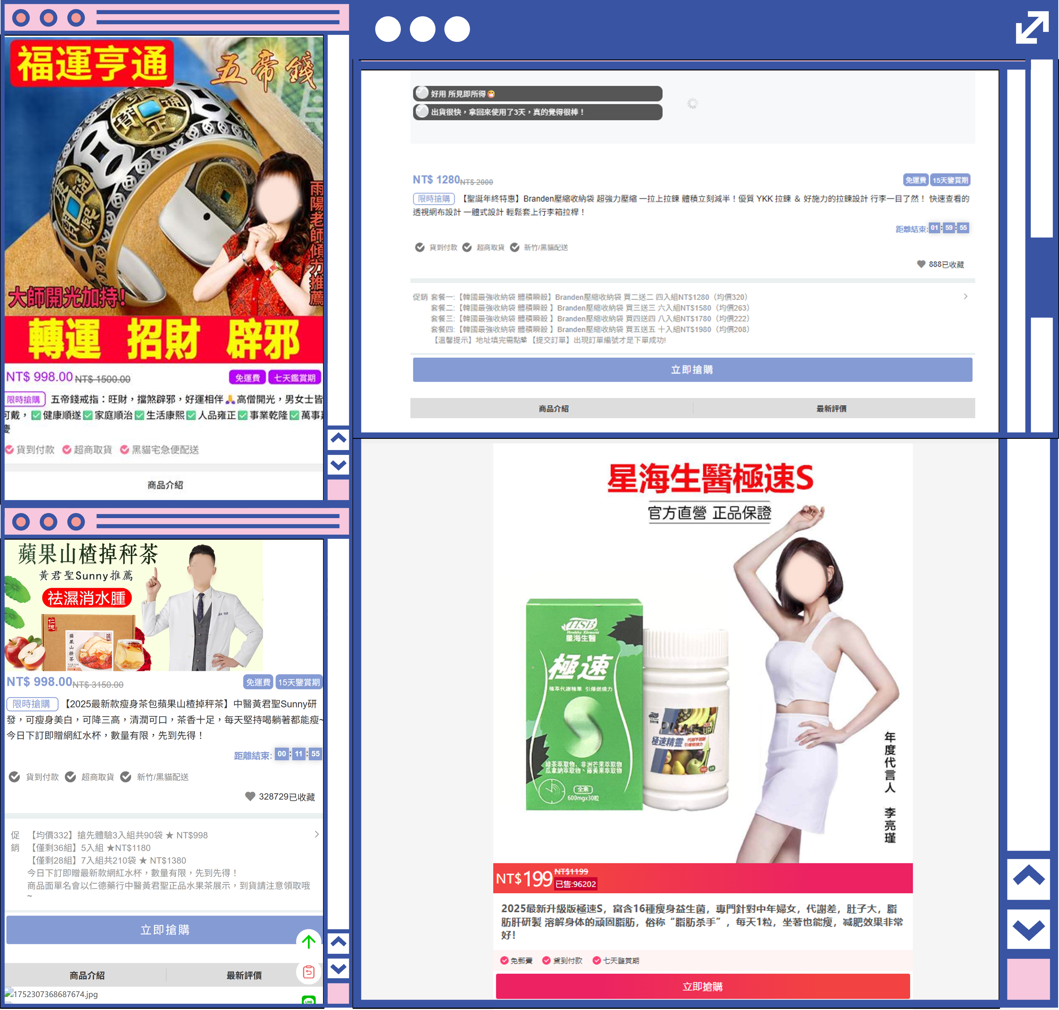 🛠️偽冒名人代言販售仿冒品:詐騙業者常利用名人照片、訪談截圖或捏造推薦語,營造商品「有代言、很可靠」的形象,實際上名人並未參與或授權。這類商品多為仿冒品或來路不明,品質與安全性難以保障。