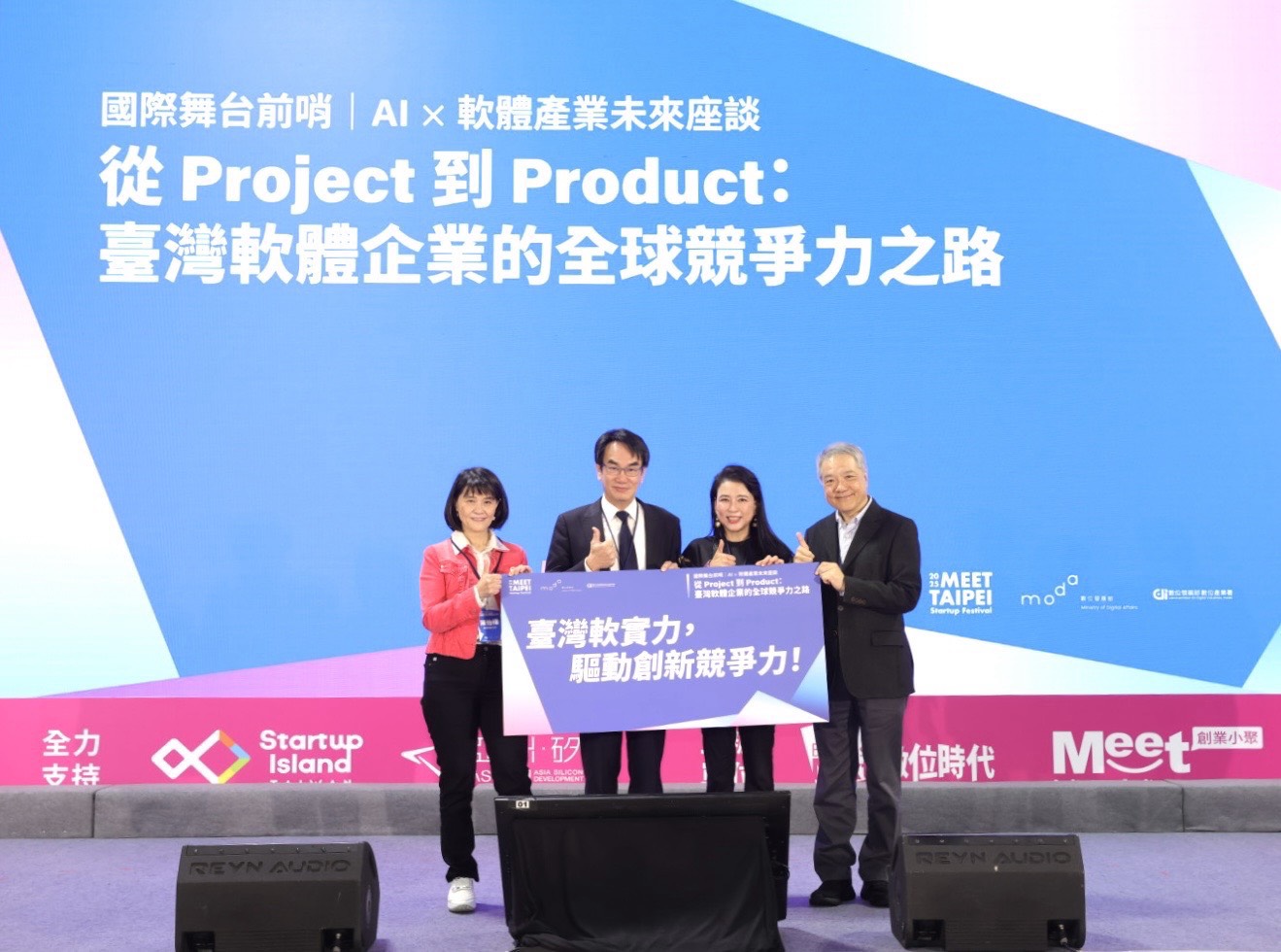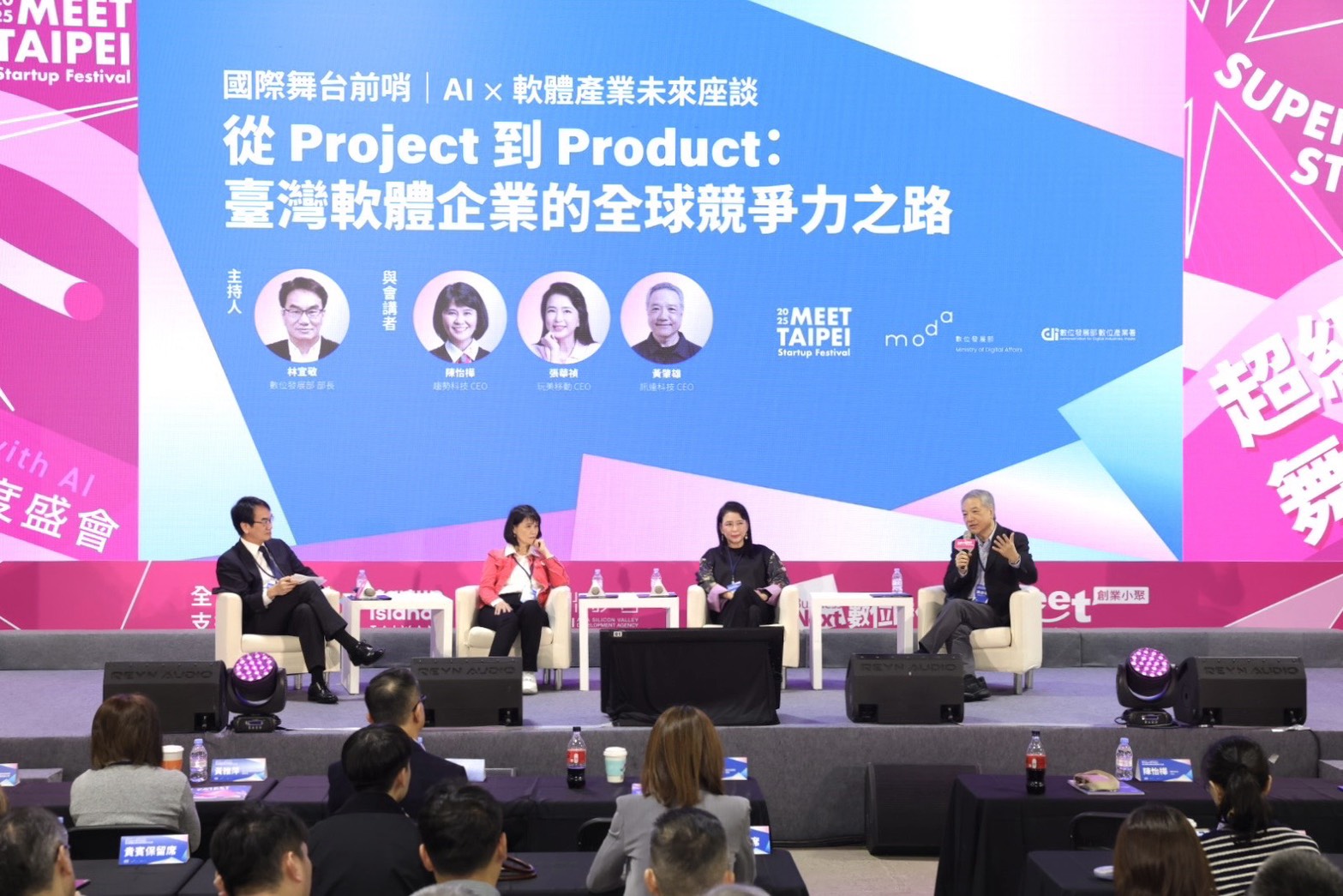The Ministry of Digital Affairs (moda) convenes "From Project to Product: Taiwan's Path to Global Competitiveness in Software" forum on November 22 during the 2025 Meet Taipei Startup Festival. Minister Yi-Jing Lin (林宜敬) led an in-depth discussion with the Trend Micro CEO Eva Chen (陳怡樺), Perfect Corp. CEO Alice Chang (張華禎), and CyberLink CEO J.H. Huang (黃肇雄) on Taiwan's opportunities for transformation of its software industry under the wave of AI and Cloud technologies.
